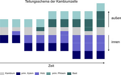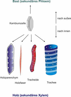 Die Zellen des Kambiums teilen sich und geben abwechselnd nach aussen und innen Zellen ab. Diese Teilungsrichtung wird auch tangentiale Teilung gennant. Die Zellen, die nach innen abgegeben werden nennt man zusammenfassend Holz, die nach aussen abgegebenen Zellen gemeinsam Bast. Die Zellen des Holzes bezeichnet man auch als sekundäres Xylem, da sie den gleichen Gewebetyp wie das Xylem der Leitbündel darstellen. Dazu kommen noch Mark- und Holzstrahlen, so wie das Holzparenchym. Die Elemente des Holzes sind also prinzipiell die gleichen wie die des Xylems und im Holz eines Stammes findet auch die Wasserleitung statt.