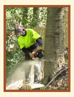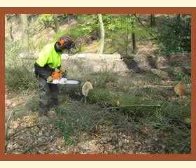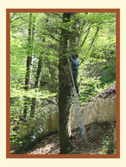 Ein Waldarbeiter legt eine Schlinge aus Drahtseil um den Baum, der gefällt werden soll. Später wird der Baum durch das Seil umgezogen. So vermeidet man, dass der Baum in die falsche Richtung fällt, denn der Keil, der in den Stamm gesägt wird, bestimmt nicht immer die Fallrichtung. |
