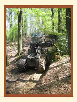 Die Baumstämme werden mit einem Spezialfahrzeug zu einem Sammelplatz bewegt, der in der Regel an einem Weg, oder am Waldrand liegt. |
