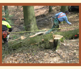 Nachdem der Keil gesägt ist, wird der Baum mit dem Seil endgültig zu Fall gebracht. Sofort wird er vermessen (gelbes Maßband) und die Maße notiert. |