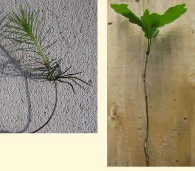 Links: Ein Keimling einer Fichte. Der Spross befindet sich im primären Zustand. Rechts: Dieser Keimling einer Eiche ist schon etwas älter. Im unteren Bereich hat das sekundäre Dickenwachstum bereits eingesetzt: Holz hat sich gebildet.