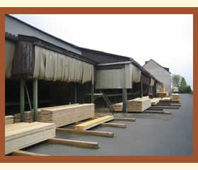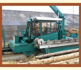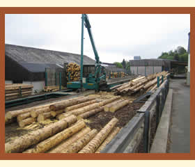 Die Baumstämme werden mit LKW angeliefert und vor der Schälmaschine abgeladen. |
