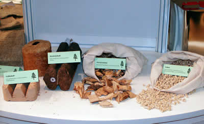 Holzbrennstoffe: von links nach rechts: Grillbrikett, Rindenbrikett, Hackschnitzel, Holzpellets |